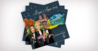 Portraits des trois membres d’un cabinet d’avocats de Tours. Sur la carte, les principaux sites tourangeaux sont colorisés. Portraits réalisés par Monsieur Agency d’après photos. Cartes voeux imprimées.