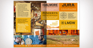 Un caviste propose une présentation des différents whiskies (Européens, américains, japonais…). Recherche du nom, des tonalités et maquette.