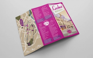 À la suite du logo créé, maquette du matériel de communication, cartes postales, cartes de visite et création d’un flyer/visite guidées de Loches. Illustrations originales travaillées dans les teintes de la charte.